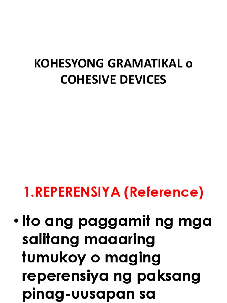Kohesyong Gramatikal Cohesive Device Reference Cohesive Device Reference o kohesiyong gramatikal ay nagpapatungkol sa mga salitang nagsisilbing pandanda upang hindi maging paulit-ulit ang. TALASALITAAN 3 Upang hindi magulat ang kanyang. Hindi naman daw sinasadya ang nangyari kaya patawarin mo na siya.
