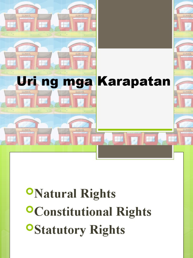 Natural Rights Mga karapatang taglay ng bawat tao kahit hindi ipagkaloob ng Estado Hal. Dagdag pa rito nilikha. Ang mga karapatang ito ay nararapat na taglay ng bawat indibiduwal dahil taglay nito ang dignidad ng isang tao anoman ang kaniyang katayuan sa lipunan at kalagayang pang-ekonomika.