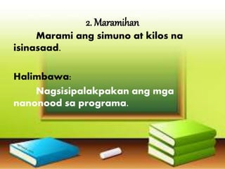 0 found this document useful 0 votes 135 views 16 pages. 21 Mahigpit niyang hinangad na mabusog mula sa mga mumong nahulog mula sa hapag-kainan ng mayamang lalaki. Ginagamitan ito ng mga panlaping na nag um at in.